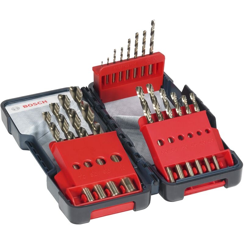 Kit di accessori HSS-Co fornito in una scatola Toughbox. Adatto per acciai legati e non legati con resistenza alla trazione massima di 1000 N/mm², acciaio inossidabile V2A/V4A, ghisa grigia, acciaio fuso, acciai resistenti all'acidità e al calore. Foreste elicoidali di precisione molto resistenti al calore e all'usura. Lavorato in massa e affilato con precisione (taglio a destra). foreste per uso universale, per l'uso con supporti di perforazione e trapani a colonna. Permette di perforare senza puntamento preliminare e continuare il lavoro con grande precisione grazie alla sua eccellente concentricità di rotazione. Punta a 135° autocentrante, affilatura a croce a norma DIN 1412 C. Raffreddamento obbligatorio.