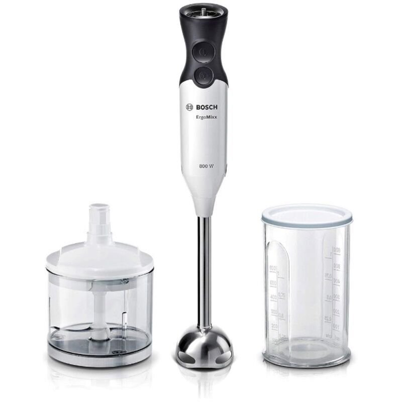 Bosch ErgoMixx MS6CA4120 - Frullatore a immersione in acciaio INOX, con base per mixer e misurino, 4 lame, alloggiamento leggero, 12 livelli più turbo, 800 W, colore: bianco/antracite