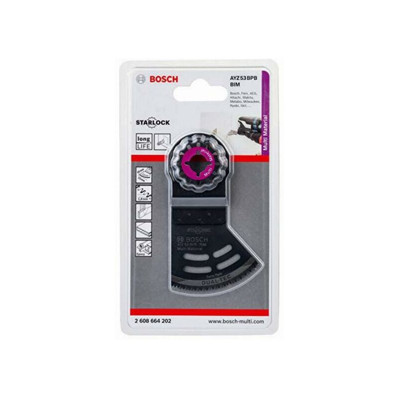 Due tecnologie in una lama La lama Starlock AYZ 53 BPB Dual/Tec garantisce tagli da pieno precisi e tagli dritti su legno e materiali abrasivi. La sua caratteristica forma asimmetrica consente di ottenere tagli di elevata precisione sui bordi. La lama è caratterizzata da una dentatura stradata che consente il taglio più veloce senza lasciare tracce di calore. Inoltre, grazie all'ampia superficie si ottengono tagli diritti lunghi e precisi. Questa lama è ideale per tagliare lastre di cartongesso, truciolare e pannelli sandwich. È idonea per tutti gli utensili multifunzione Starlock, Starlock Plus, Starlock Max e OIS. Il sistema di montaggio Starlock consente di cambiare la lama velocemente, senza toccarla. Il sistema di montaggio favorisce il trasferimento della potenza fra macchina e accessorio in maniera ottimale, grazie all'accoppiamento tridimensionale stretto. Dotazione di fornitura: 5 x lama Starlock AYZ 53 BPB Dual-Tec - Lunghezza: 40 mm, larghezza: 53 mm