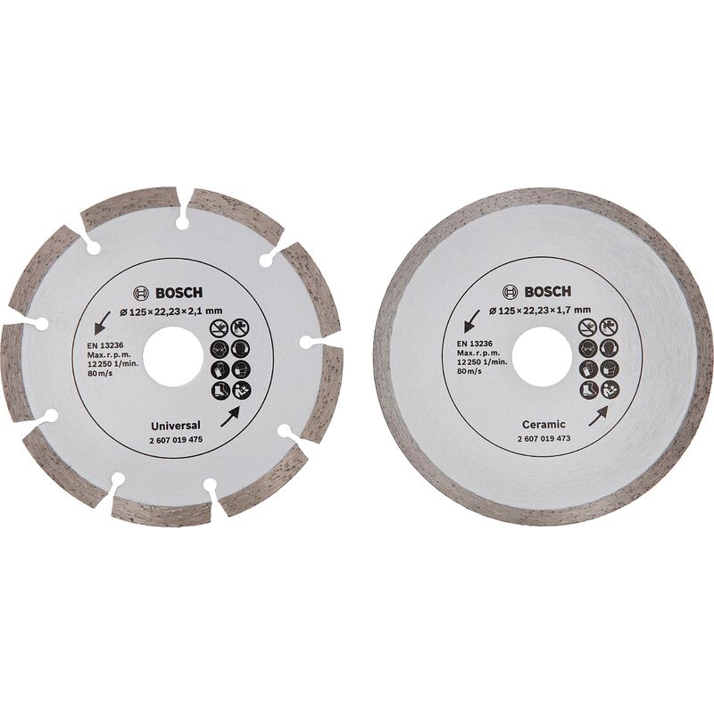 Descrizione Bosch, dischi diamantati, 2 pezzi, ideali per piastrelle e materiale da costruzione I dischi diamantati di Bosch con un diametro di 125 mm sono compatibili con smerigliatrici angolari di tutte le marche di elettroutensili con il diametro corrispondente. Garantiscono un lavoro senza particolari sforzi con piastrelle dure e morbide o vari materiali da costruzione mostrando un importante prova della loro durata. Grazie al tagliente circonferenziale e segmentato,gli appassionati di fai da te possono ottenere tagli particolarmente fini e puliti. Realizzato secondo i più alti standard di qualità, ogni disco garantisce anche la massima sicurezza durante il lavoro. Idoneo per tutte le comuni smerigliatrici angolari. Dotazione di fornitura: 1 x disco diamantato Bosch Universal - Ø 125 x 22,23 x 1,7 mm 1 x disco diamantato Bosch Ceramic - Ø 125 x 22,23 x 1,7 mm Contenuto della confezione 1 x disco diamantato Bosch Universal - Ø 125 x 22,23 x 1,7 mm / 1 x disco diamantato Bosch