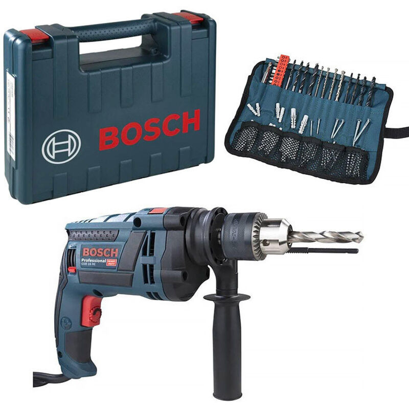 Dettagli tecnici Caratteristiche elettroutensile incl. accessori, incl. valigia Momento torcente (max.) 2.3 Nm Peso 2.2 kg Potenza 750 W Tipo prodotto Trapano a percussione Potenza erogata: 380 WNumero di colpi al regime del minimo: 0 - 47.600 bPM Trapano a percussione Bosch GSB 16 RE, 750 watt, incl. 100 pz. Kit di accessori, arresto di profondità e impugnatura aggiuntiva nella valigetta Trapano a percussione professionale con mandrino Ø 13 mm in una struttura compatta per una maneggevolezza ottimale. Riposto nella pratica valigetta e dotato di 100 accessori, che a sua volta si trova in una borsa a rotelle richiudibile. Testo tradotto automaticamente Punti di forza e dettagli 750 W Ø foratura max. Muratura 18 mm, Legni mm, Acciaio 13 mm Incluso nella consegna Trapano a percussione, Impugnatura aggiuntiva, Chiave mandrino, Arresto di profondità, Borsa a rullo con 100 - accessori in pezzi:, 1 portapunte 1/4, 10x bit 1/4 25 mm (PH / PZ / SL / TX / hex), 4 punte per legno (4, 5, 6, 8