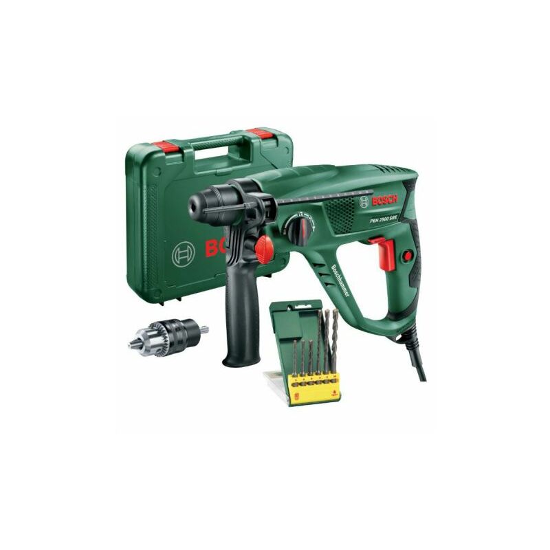 Martello perforatore da 600 Watt, mandrino SDS-plus con adattatore mandrino a cremagliera, elettropneumatico, reversibile, elettronico con funzione di scalpellatura. Varioblock, Rotostop, funzionamento in continuo. Diametro foro legno 30 mm, Diametro foro acciaio 13 mm, Diametro foro calcestruzzo 22 mm. Potenza del colpo 1,9 Joule, 2.000 giri/minuto, 5.000 colpi/minuto In dotazione: adattatore mandrino a cremagliera, impugnatura supplementare, asta di profondità, valigetta + Set 6 punte SDS-Plus.