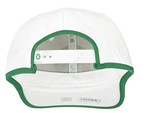 Elegante cappellino da baseball bianco con un contorno verde | Ricamo del logo dei Celtics in 3D sul davanti | Etichetta con il logo dei Celtics sulla chiusura a snapback | Bandiera di New Era sul lato sinistro del cappello
