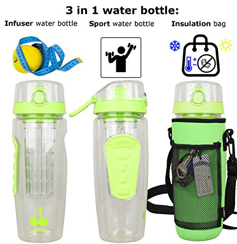 Soluzione 3 in 1: 1) Bottiglia d'acqua infusore frutta + 2) Bottiglia d'acqua Sport + 3) Bottiglia d'acqua isolato
