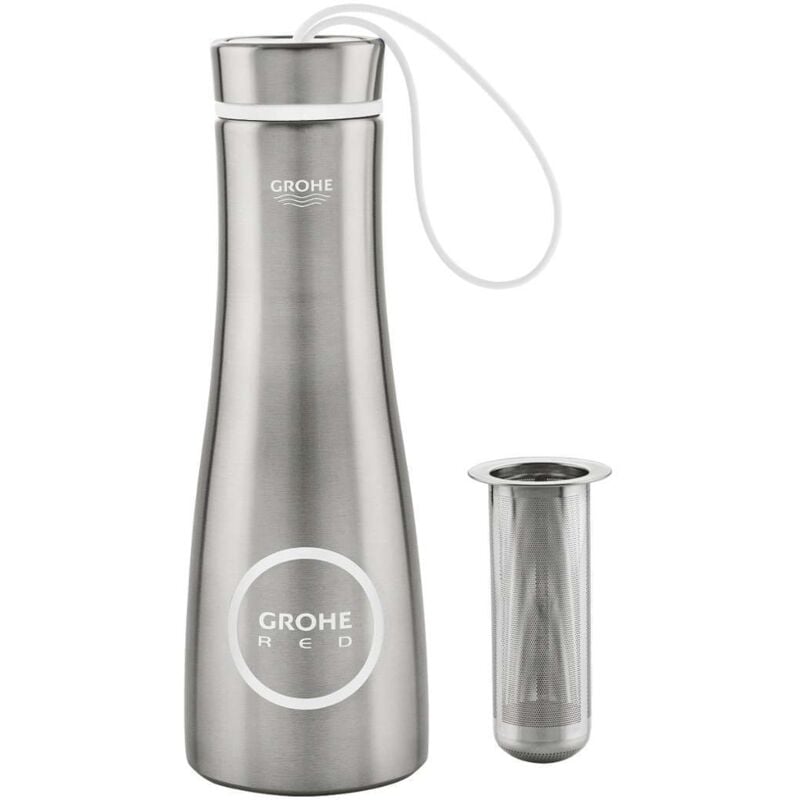 Bottiglia Termica in Acciaio Inox con Infusore Grohe 40919SD0 450ml in acciaio inox con logo GROHE Red doppio rivestimento interno coperchio con cinturino con infusore capacità 450 ml