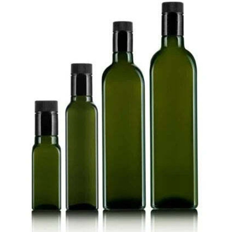 Specifica per la conservazione di olio. Realizzata in vetro adatto per prodotti alimentari. Imboccatura 'tappo a vite'. Colore uvag.