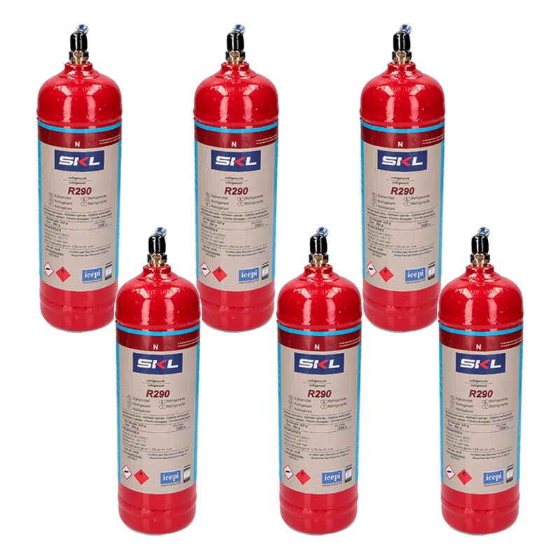6 bottiglie. Gas refrigerante R290 Contenitore SKL usa e getta. Propano R-290. 370 grammi.