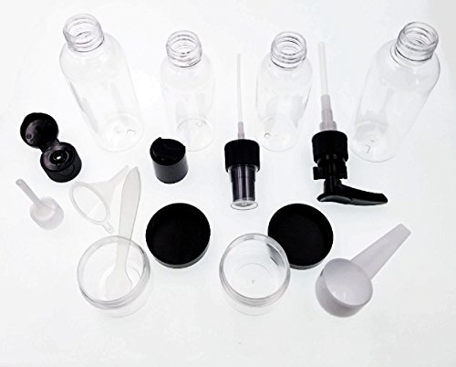 Il set bottigliette da viaggio è composto da: 1 bottiglia spray 50ml + 1 bottiglia a pompetta 50ml + 2 flacone 80ml + 2 vasetto piccolo 20ml + 4 strumenti (1 spatolina, 1 cucchiaino, 1 imbuto, 1 pipetta), e con una confezione da viaggio per portarli tutti.