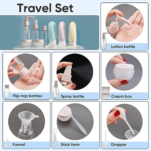 KIT VIAGGIO COMPLETA: Si tratta di un bell'assortimento di contenitori da viaggio in una comoda borsa con chiusura a zip (3 flaconi, 2 vasetti, 1 flacone spray, 1 barretta, 1 imbuto, 1 flacone flip top, 1 flacone di lozione, 1 contagocce, 1 astuccio). Grazie ai diversi flaconi, è possibile trasportare diversi prodotti di bellezza e articoli da toilette a seconda delle proprie esigenze.