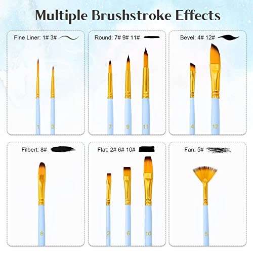 ▶ Tipo multifunzionale di set di pennelli acrilici: Un vero set di pennelli da artista con Flat, Bevel, Fan, Filbert, Round e Fine Liner, sia per grandi riempimenti o linee dettagliate, questo pennello da pittura soddisferà tutte le tue esigenze di pittura.