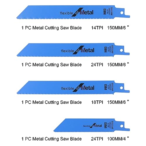 Set di Lame per Sega: Lama BIM da 4 pezzi per legno con metallo Blu (3 lame per sega da 150 mm, 1 lama per sega da 100 mm per metallo), 19 pezzi Lama HCS (8 x 10TPI 150 mm, 8 x 6 TPI 150 mm, 1 x 3 TPI 225 mm, 1 x 5 TPI 240 mm, 1x 6TPI 225mm).