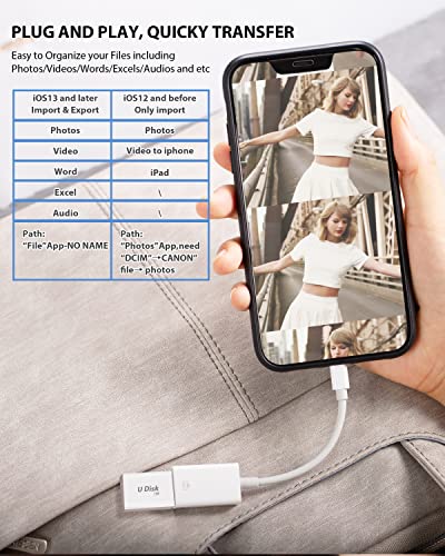 [Plug and Play, sincronizzazione ad alta velocità] Collegalo con Adattatore per Fotocamere da Lightning a USB, il tuo iPhone/iPad/iPod riconoscerà e leggerà automaticamente i dati sul dispositivo di archiviazione collegato come una fotocamera digitale. Apri l'app "File", scegli e apri i file del dispositivo di archiviazione esterno, quindi puoi selezionare qualsiasi foto, video, parole, excel, audio da scaricare a velocità USB 2. Puoi organizzare le foto e i video importati nell'app Foto.