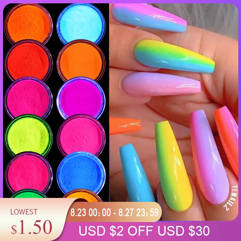 12 Boxes Neon Pigment Powder Set Fluorescent Nail Glitter Shinny Ombre Chrome Dust DIY Gel Polish For Nails Art Decor 6 Boxes
