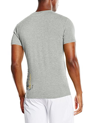 T-shirt Girocollo In Cotone Grigio Mélange A Maniche Corte Con Costine Sul Collo. Il Capo È Caratterizzato Da Un Maxi Logo Di Colore Nero Stampato In Orizzontale All'altezza Del Petto E Da Un Mini Logo Di Colore Nero Stampato Sul Retro In Verticale, All'altezza Del Fianco Sinistro. Una T-shirt Grintosa Che Completa Perfettamente Idealmente Un Outfit Pensato Per Il Tempo Libero.