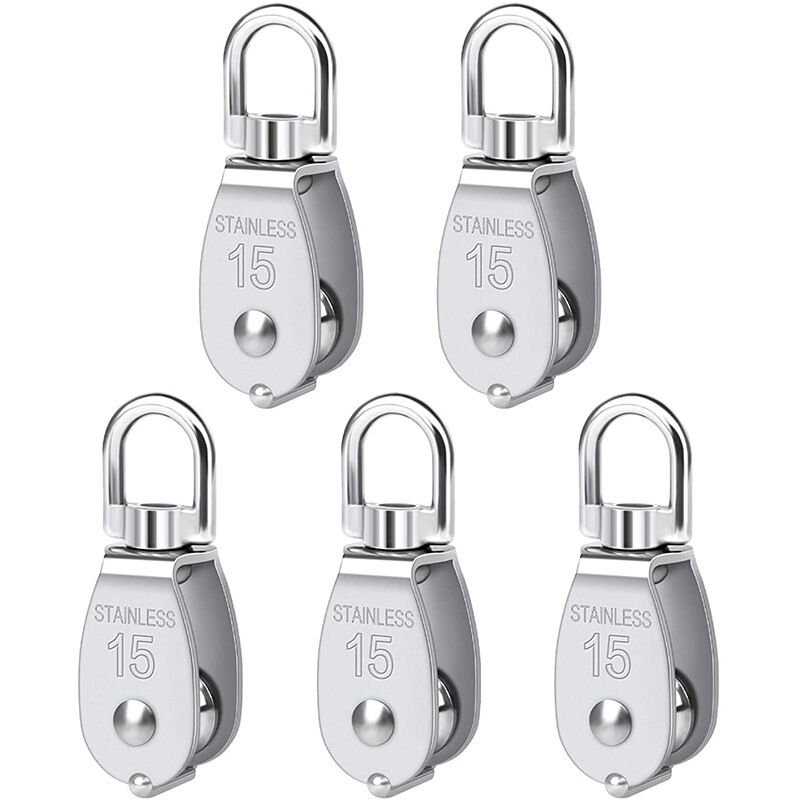 Materiale Premium -- Acciaio inossidabile 304, antiruggine e resistenza all'usura con struttura molto robusta Rotazione di 360 gradi -- 5 pulegge singole M15 con la ruota rotante, rotazione di 360 gradi per evitare cavi, cavo, fili da annodare per un uso conveniente Dimensioni -- Circa 60 x 20;