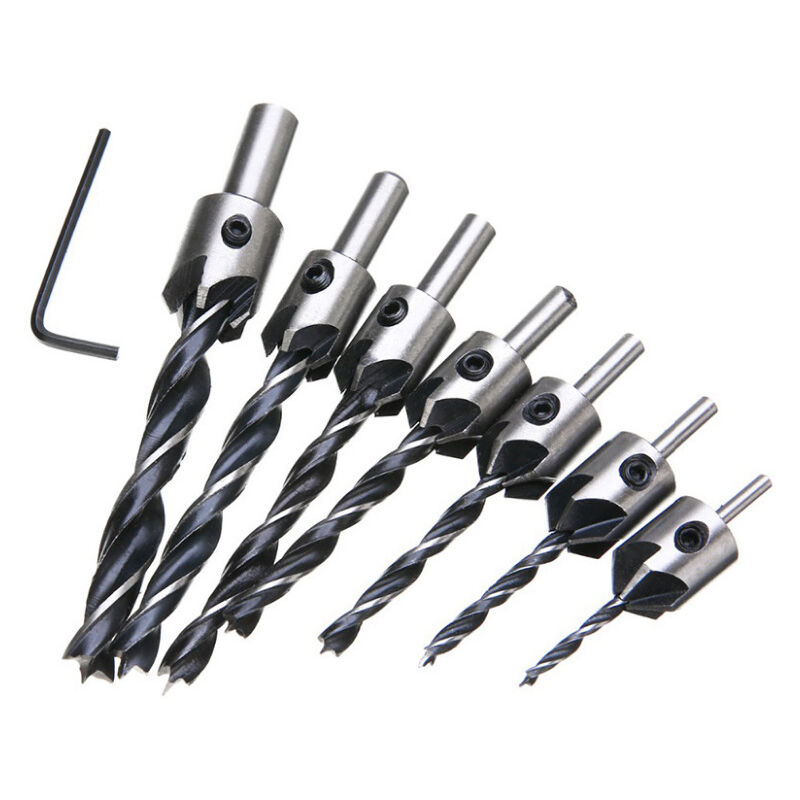 7 + 1 PZ Punte diverse - Punte per la lavorazione del legno da 3 mm, 4 mm, 5 mm, 6 mm, 7 mm, 8 mm, 10 mm e una chiave esagonale. È possibile utilizzare la chiave esagonale per allentare e serrare la vite e regolare la lunghezza della taglierina. può anche essere utilizzato per lo smontaggio e l'installazione di punte da trapano 【Acciaio HSS】 Le nostre punte da trapano per la lavorazione del legno sono realizzate in acciaio HSS, formando un foro svasato forte e affilato, con elevata durezza e buona resistenza all'usura. resistente al calore, che può essere tagliato in qualsiasi direzione per garantire fori a fondo piatto precisi e puliti. buono per la perforazione precisa e veloce. Il design dello smusso a cinque taglienti della punta svasatore può eliminare legno e detriti più rapidamente e automaticamente 【Applicazione】per il montaggio della punta a sfera del cassetto;