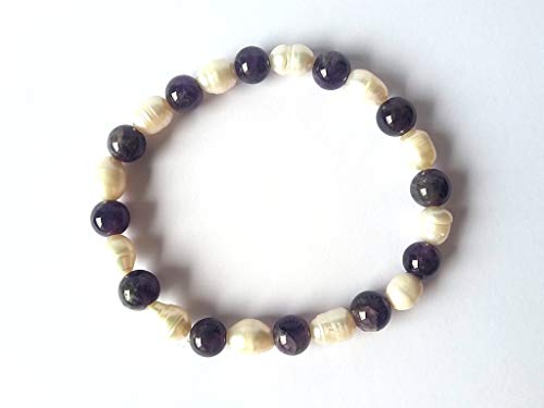 Bracciale in Ametista e Perla di Fiume, Pietre Dure Naturali, Elastico 19 cm, Fatto a Mano