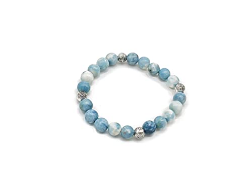 Bracciale Azteco Unisex in Larimar, con Sfere in Metallo, Pietre Dure, Elastico 19cm, Fatto a Mano
