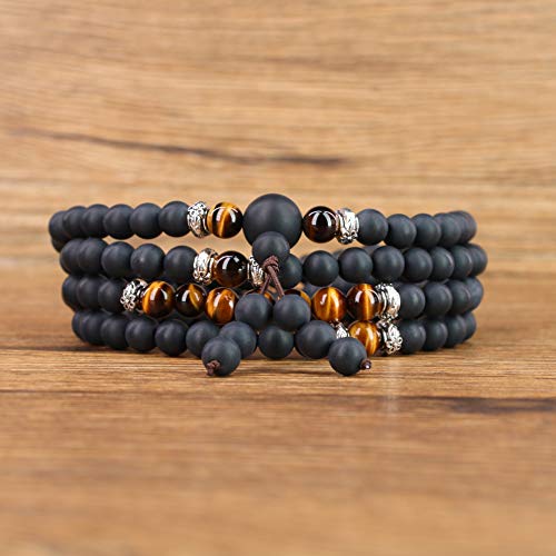 COAI Bracciale Collana 108 Perle Mala in Onice Opaca e Occhio di Tigre Marrone, Bracciale Tibetano da Preghiera in Pietre semi-preziose