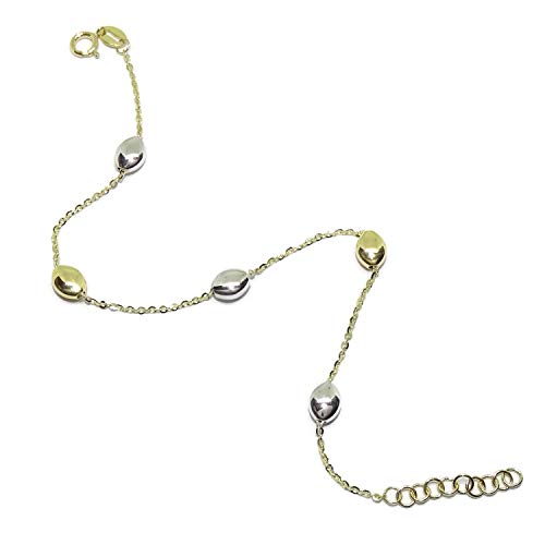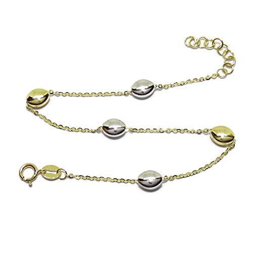 Bracciale da donna in oro bicolore da 18 k con ovale da 5 x 7 e 19 cm di lunghezza che si può chiudere a 17 cm grazie ai suoi molteplici anelli per la chiusura a molla. Peso: 2,15 g di oro 18 carati.