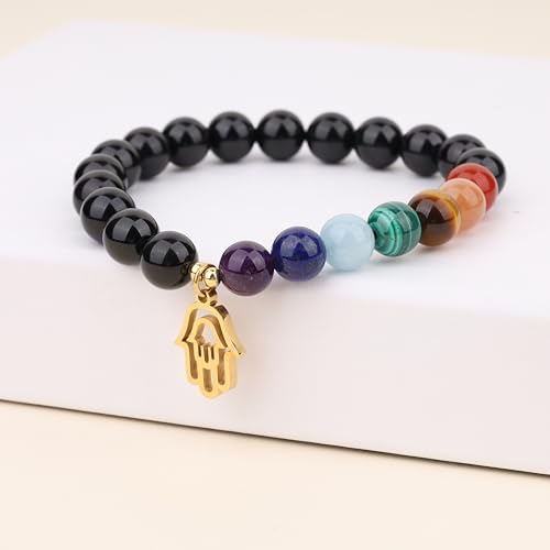 COAI Bracciale Mano di Fatima con Perle in Tormalina Nera e Pietre Chakra Taglia S