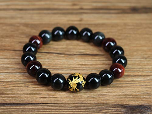 COAI Bracciale da Meditazione con Pietre in Ossidiana e Occhio di Tigre con Perla Intarsiata Raffigurante Drago 10mm