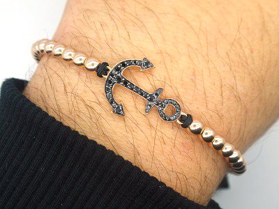 Bracciale Nardelli uomo, oro rosso 18kt a sfere lisce con ancora in diamanti neri, montato con cordino nautico, peso totale delle gemme 0,27 certificati