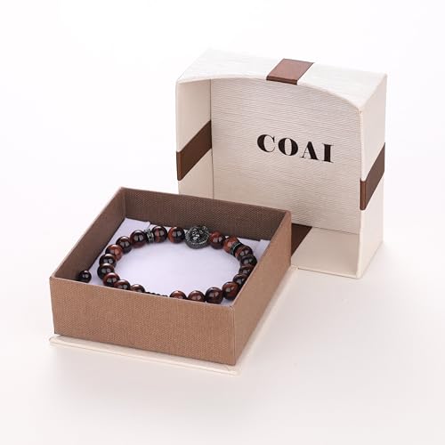 COAI Bracciale da Uomo Regolabile in Occhio di Tigre Rosso con Amuleto Testa di Leone in Rame, Bracciale di Ispirazione Shamballa con Pietre Semi-preziose