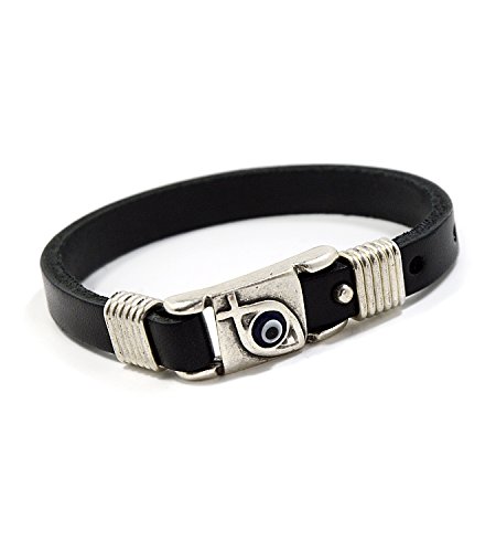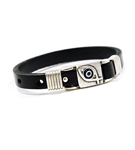 Bracciale da uomo regolabile in pelle nera con lega (Ichtys) Gesù Fish & Evil Eye Protection Charm - Protezione gioielli per uomo, Pelle