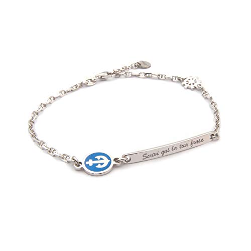 Bracciale con targhetta regalo uomo ragazzo con una bellissima ancoretta marina e timone portafortuna argento 925 Placcato in oro bianco (incisione su targhetta personalizzata)