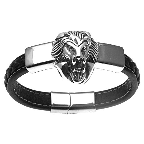 Bracciale uomo con testa di leone acciaio pelle - bcc0157