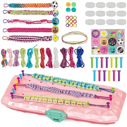 【Materiali ricchi】 Il kit artigianale per bracciale dell'amicizia include 1 istruzioni dettagliate per immagini, 16 corde intrecciate, 1 dispositivo per intrecciare, 12 trecce elastiche, 12 bottoni, 12 chiodi colorati, 13 perline, 1 adesivo e 1 scatola di colori.