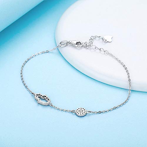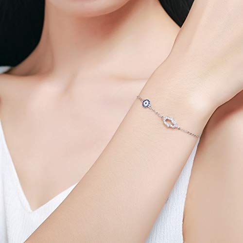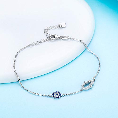 Braccialetto con ciondoli a forma di mano di Fatima (Hamsa) e di occhio Evil Eye di colore blu, in argento Sterling 925, con zirconia cubica, dimensioni: 16,5 cm + 3,8 cm
