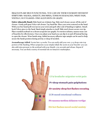 INDICAZIONI COMPLETE E GRAFICI INCLUSI. Il braccialetto utilizza punti di digitopressione funzionali (H7 / P7 / LU9 / H6 / P6 / LU8) che sono una soluzione efficace per ridurre o alleviare completamente i sintomi di ansia, insonnia, stress, mal di testa, nausea e palpitazioni in modo naturale. Per le posizioni dei punti di pressione, vedere il grafico dell'immagine del prodotto. Misurare la piega del polso.