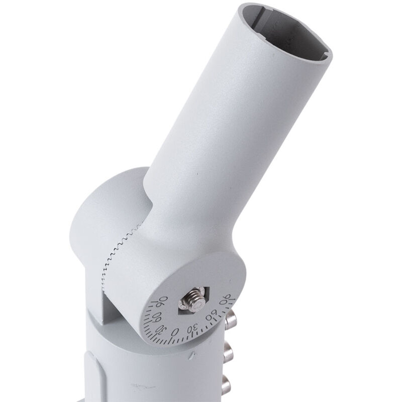 Braccio articolato in alluminio progettato per l'installazione di un apparecchio di illuminazione pubblica su un palo o una colonna stradale. La parte con il diametro maggiore si fissa a pali con un Ø massimo di 65 mm. La parte con il diametro più piccolo incorpora tre viti per fissare apparecchi di Ø 50 mm con un angolo da 0 a 180°.
