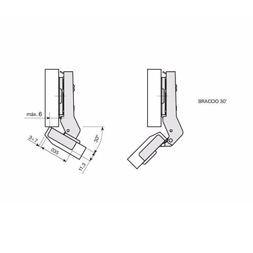 BRACCIO a Scelta (30°, 45°, 90°) CERNIERA clip Chiusura SOFT AMMORTIZZATA per anta MOBILI registro 3D + Basetta H0 + COVER in REGALO. (Braccio 30°)
