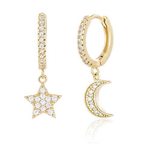 Brandlinger ® Orecchini pendenti in argento 925 con ciondolo a forma di luna e stella. Gioielli da donna placcati in oro 18 carati (argento e oro) per donne e ragazze. Diametro degli orecchini a cerchio 12 mm., Argento sterling