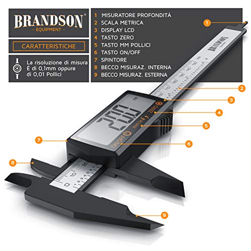 Brandson - calibro digitale da 150 mm con display LCD - mm e pollici - alta risoluzione 0,01 mm - Meccanismo di scorrimento preciso - Elevata precisione di misura - ip54 - Funzione Zero in posizione