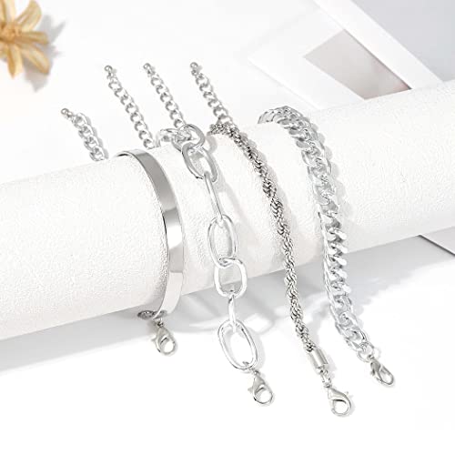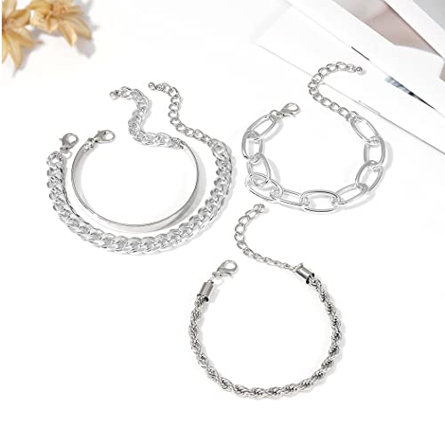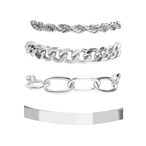 Branets Set di 4 bracciali a strati Boho per donna - Regolabili - Catena di metallo attorcigliata - Stile punk - Regalo perfetto per donne e ragazze - Argento