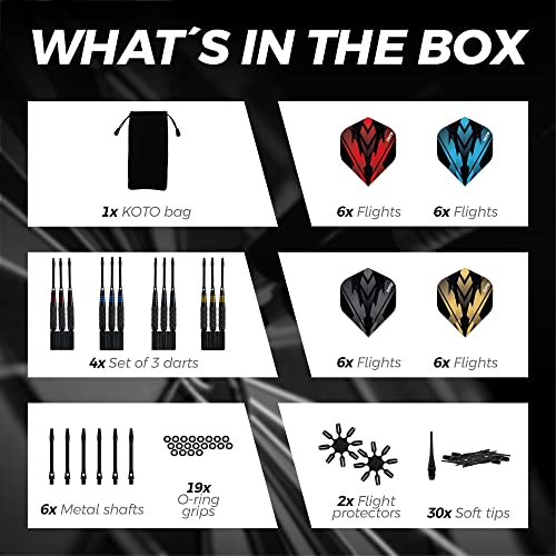 Il KOTO Freccette 90% viene fornito come set completo. Il set è composto da 3 aste, due set di punte con logo KOTO, due set di corpi KOTO in formato corto e medio e una borsa porta freccette con logo KOTO.