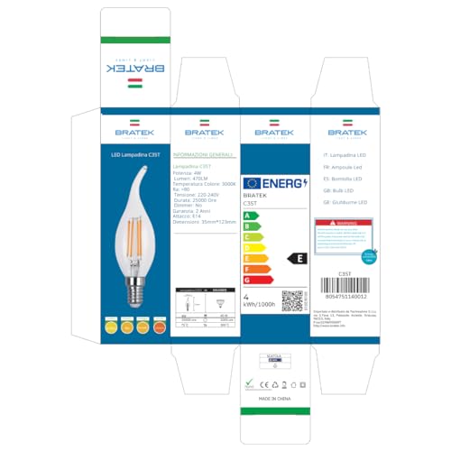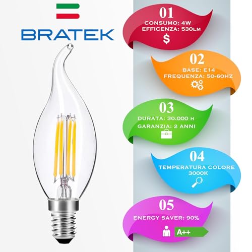BRATEK - 10 Lampadine led e14 luce calda 3000K - Lampadine a led e14 4W - Set lampadine attacco piccolo interni ed esterni 4W - Lampadine a fiamma vintage