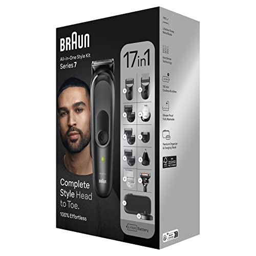 Rasoio elettrico barba e capelli Braun 17-In-1 per la rasatura dalla testa ai piedi: accessori studiati per la rifinitura di barba, orecchie e naso, tagliacapelli e depilazione maschile per tutto il corpo