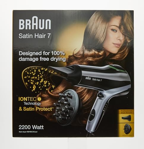 Braun Satin Hair 7 BRHD730E Asciugacapelli 2200W, Tecnologia IONTEC Anti-crespo, 3 Temperature/ 2 Velocità, Concentratore sottile e Diffusore, Nero