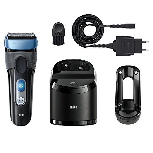 Contenuto: rasoio Braun Series 3 °CoolTec, stazione di pulizia Clean&Charge, cartuccia di pulizia, spazzolina di pulizia, alimentatore intelligente con regolazione automatica del voltaggio 100-240 V