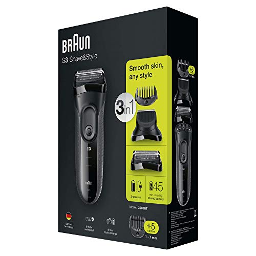 Braun Series 3 Proskin Shave & Style 3000BT 3-In-1 Rasoio Elettrico Uomo con Regolabarba di Precisione e 5 Pettini, Ricaricabile e Senza Fili, Nero/Grigio