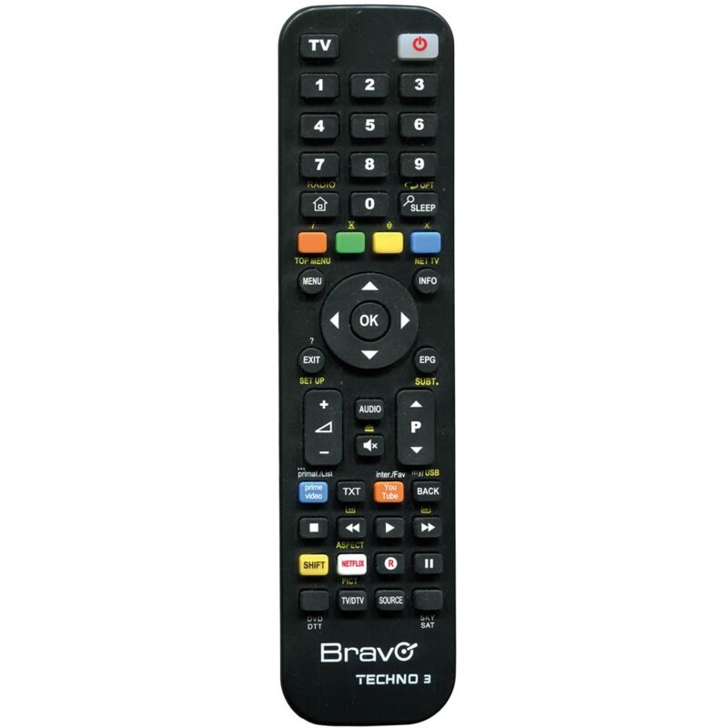 TELECOMANDO UNIVERSALE PER TUTTE LE TV THECNO 3 PROGRAMMABILE 100% QUALITY ***Attenzione *** TELECOMANDO PROGRAMMABILE SOLO CON PC CARATTERISTICHE TECNICHE Telecomando a tre banchi di memoria programmabile con facilità Sostituisce le principali funzioni degli apparecchi TV, VCR, DVD, SAT, DTT o SKY Programmabile tramite PC con cavo IR con il catalogo BRAVO il cui database viene aggiornato mensilmente con i nuovi telecomandi presenti sul mercato Copre tutti i modelli presenti sul catalogo BRAVO Per la programmazione è necessario il cavo e il catalogo forniti nel KIT BRAVO Mantiene i codici durante il cambio batterie Garanzia di due anni