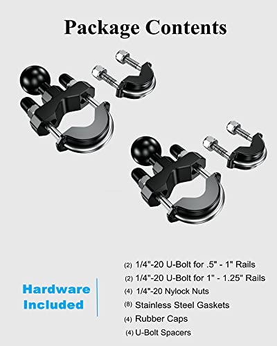 Hardware incluso: (2) 1/4"-20 U-Bolt per 0,5" - 1" Rails, (2) 1/4"-20 U-Bolt per 1" - 1,2" Rails, (4) 1/4"-20 dadi Nylock, (4) tappi in gomma, (4) distanziatori U-Bolt (4) distanziatori a U, ((4) 8) Spazio dell'acciaio inossidabile ers.