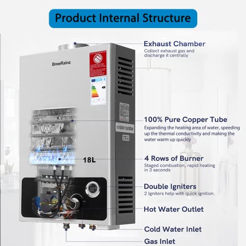 BreeRainz Scaldabagno a Gas 18LPM,36KW Scaldabagno Istantaneo a Propano,Funziona a Bassa Pressione dell'Acqua di Partenza Super Bassa, per Case,Cabine Esterno