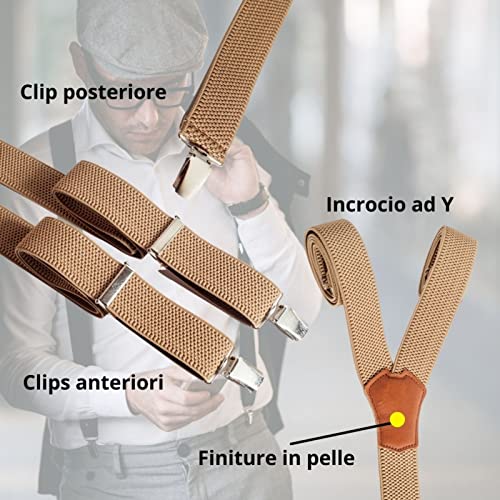 MR.M Bretelle uomo - 3 clips incrocio Y - Regolabili fino a 195cm - Finiture vera pelle - Larghezza 3,5cm - Cammello