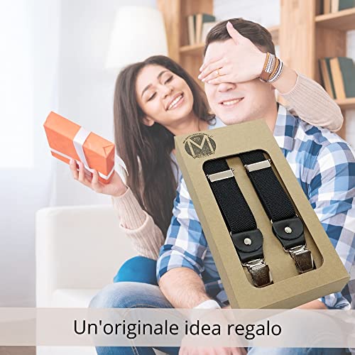 MR.M Bretelle uomo STRETTE, 3 clips incrocio Y, Regolabili a 195cm, Finiture vera pelle, Made in Europe (Nero)
